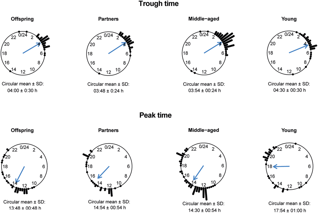 To investigate the relationship between 24-h rhythms of HR over a period of 24 to 90 h and familial longevity, results of the cosinor analyses for offspring and their partners were compared. None of the parameters of 24-h rhythms of HR, such as the mesor, absolute amplitude, relative amplitude as a percentage, minimum, maximum, trough time, and peak time, significantly differed between offspring and partners (Table 4). In addition, the trough times for both offspring and partners had a narrow time window, while the peak times for both groups were more scattered around the clock (Figure 2).