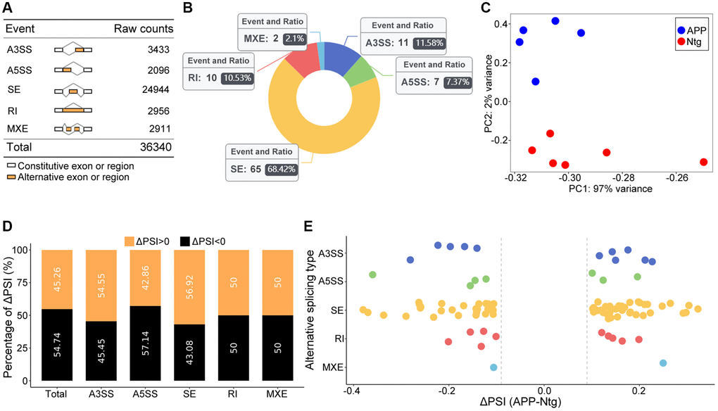 A total of 36,340 AS events were initially identified in GSE171195 dataset (Figure 1A). Eventually, 95 significant AS events were collected (Figure 1B, Table 1). The principal component analysis (PCA) revealed that these AS events clearly classified APP from Ntg group (Figure 1C). Increased PSI was found in A3SS and SE in APP group, while decreased PSI was found in A3SS and global events (Figure 1D, 1E). Top two events in each AS event were included in Table 2, and all 95 significant AS events were shown in Supplementary Table 1.