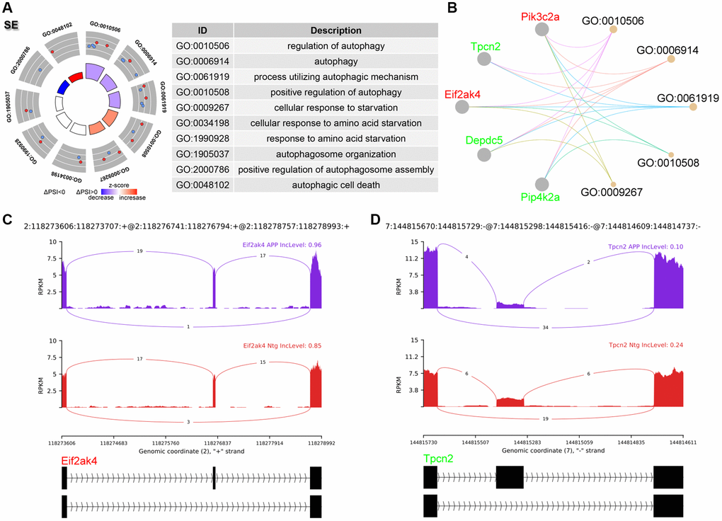 SE events ranked the most frequent AS events, accounting for 68.42% (Figure 1B). GO analysis of genes involved in significant SE events were enriched in regulation of autophagy (Figure 2A, 2B), including eukaryotic translation initiation factor 2 alpha kinase 4 (Eif2ak4) and two pore segment channel 2 (Tpcn2). Eif2ak4 tended to harbor longer exons, while Tpcn2 tended to harbor shorter exons in APP (Figure 2C, 2D).