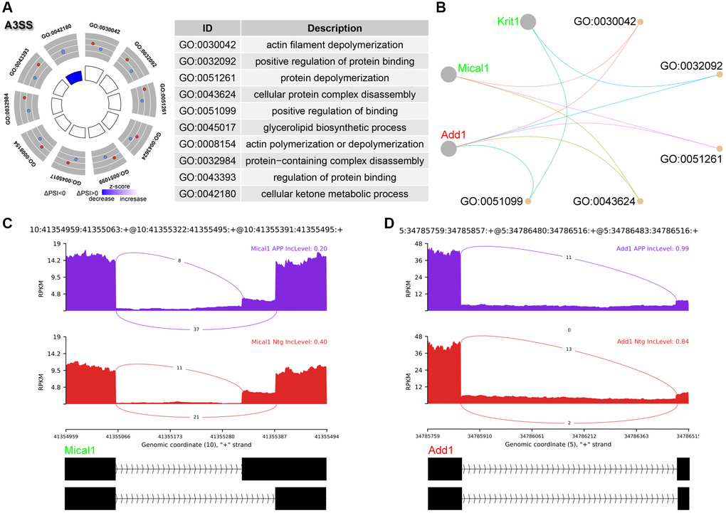 A3SS occurred due to alternative acceptor sites, and the PSI indicates inclusion of the longer exon in A3SS events. GO enrichment revealed that genes with significant A3SS events were enriched in actin polymerization and depolymerization, including Mical1 and Add1. Tau accumulation is clearly linked to AD pathogenesis. Mical1 was identified as tau interacting protein via proteomic approach. Mical1 changed the interaction properties of tau and potentiated tau toxicity, mediated by Mical1’s redox activity on tau Cys322 [19]. Moreover, the protein level of Mical1 was increased in AD patients, and considered to be a potential biomarker of tauopathies [19]. Add1 plays essential role in dendritic morphology. Zheng et al. reported that loss of miR-135a-5p expression increased Rock2 activity and phosphorylation of Add1 at Ser726, leading to dendritic abnormalities and memory impairments in AD [20].