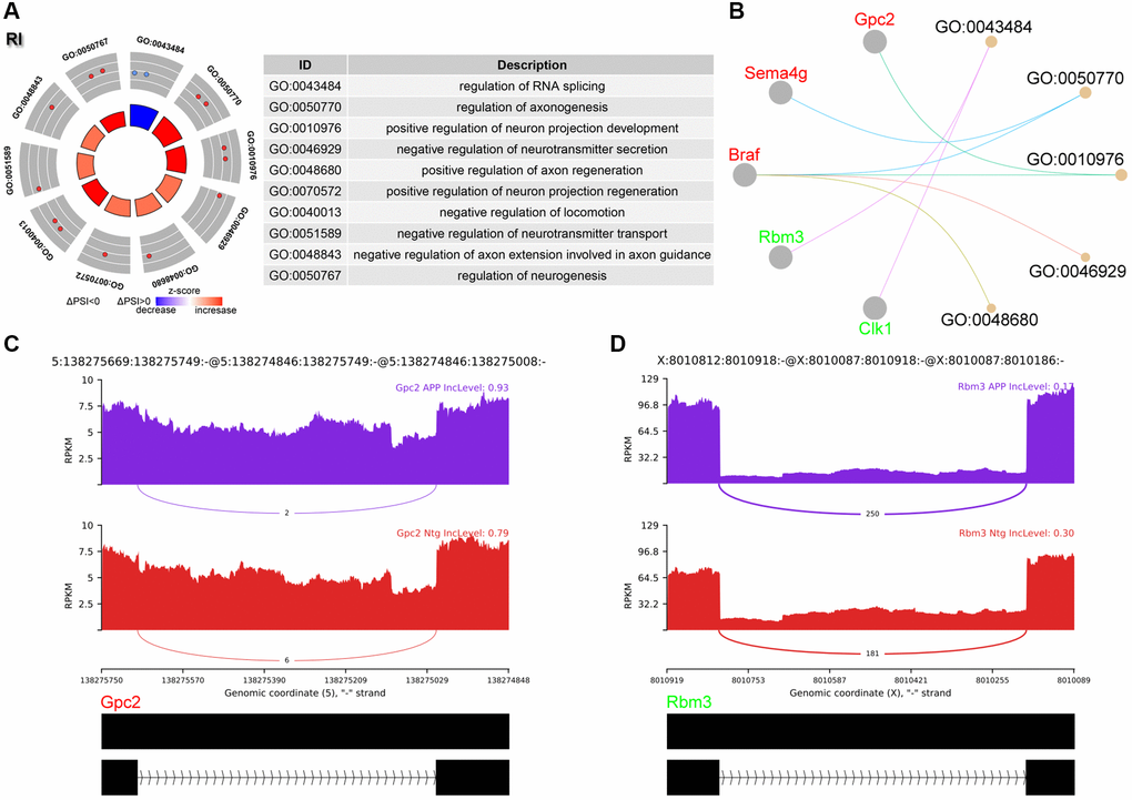 RI is third most common events in this study (Figure 1B). The PSI value referred to level of retained intron. GO analysis revealed enrichment of RNA splicing as well as synaptic plasticity including axonogenesis, neurotransmitter secretion, neuron projection and axon guidance (Figure 4A, 4B). Glypican 2 (Gpc2) showed increased RI level and enriched in neuron projection (Figure 4C). RNA binding motif protein 3 (Rbm3) showed decreased RI level and enriched in RNA splicing (Figure 4D).
