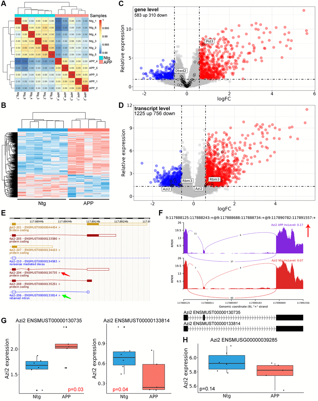 Aberrantly spliced mRNAs would be degraded by nonsense-mediated mRNA decay (NMD) pathway. However, some mRNAs may bypass NMD and be translated. Differential expressed genes and transcripts were examined. These samples were well correlated within group (Figure 5A). 583 up- and 310 down-regulated genes were identified (Figure 5B, Supplementary Table 2). Only two genes with significant AS events showed significant difference between APP and Ntg groups on gene level (Figure 5C). On transcript level, 1225 up- and 756 down-regulated transcripts were identified (Supplementary Table 3). 17 out of the 26 transcripts, whose host genes with significant AS events, were involved in SE event, 6 transcripts were involved in RI event (Table 3). Several genes with significant AS events harbored transcripts with opposite changes, including Rbm3 and Azi2 (Figure 5D, Table 3). Given Azi2 for instance, SE event resulted in a longer transcript (ENSMUST00000130735) and a shorter transcript (ENSMUST00000133814) (Figure 5E). In SE event, Azi2 showed increased PSI for the longer transcript in APP group (Figure 5F). Consistently, the longer ENSMUST00000130735 with increased PSI in APP group was elevated, while the shorter ENSMUST00000133814 with decreased PSI in APP group showed suppressed expression (Figure 5G). However, the gene level expression of Azi2 showed no significant difference (Figure 5H).