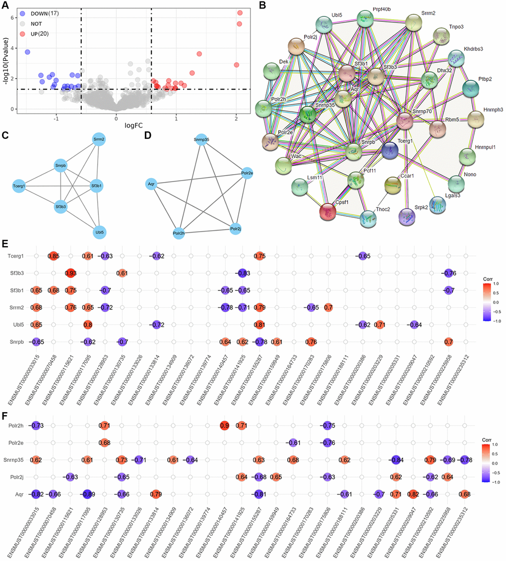 The protein-protein interaction (PPI) network analysis was performed using String (https://cn.string-db.org/) and Cytoscape (v3.8.2) [29]. The MCODE app was used to build sub clusters with default settings. The first and second clusters of significantly dysregulated splicing factor transcripts were selected for further transcript correlation analysis.