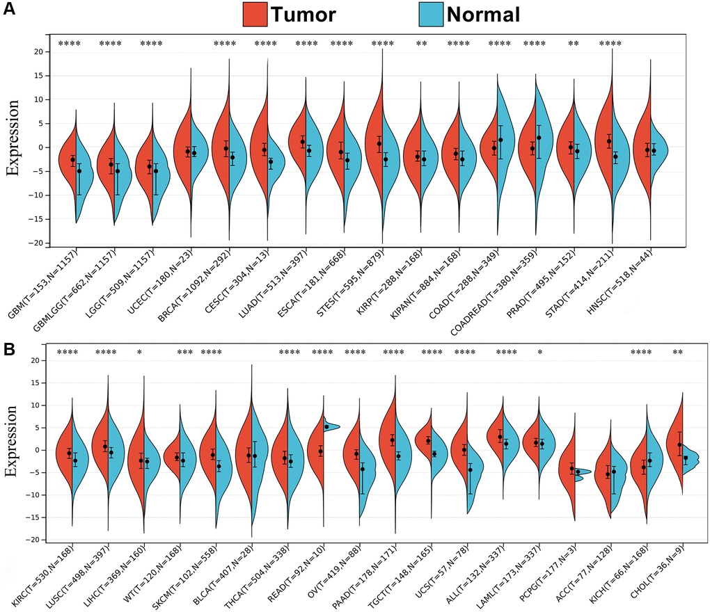 We obtained the pan-cancer dataset TCGA TARGET GTEx (PANCAN, N = 19131, G = 60499) from the University of California Santa Cruz (UCSC) Xena browser (https://xenabrowser.net/) [18]. The expression data of SPIB in each sample was extracted, and log2(x + 0.001) transformed. Finally, tumor types with less than 3 samples were excluded, and the expression data of 34 tumors were obtained (See Supplementary Table 1 for further details). Differences in expression between normal and tumor samples for each tumor type were calculated, and significant differences were analyzed using unpaired Wilcoxon Rank Sum and Signed Rank Tests.