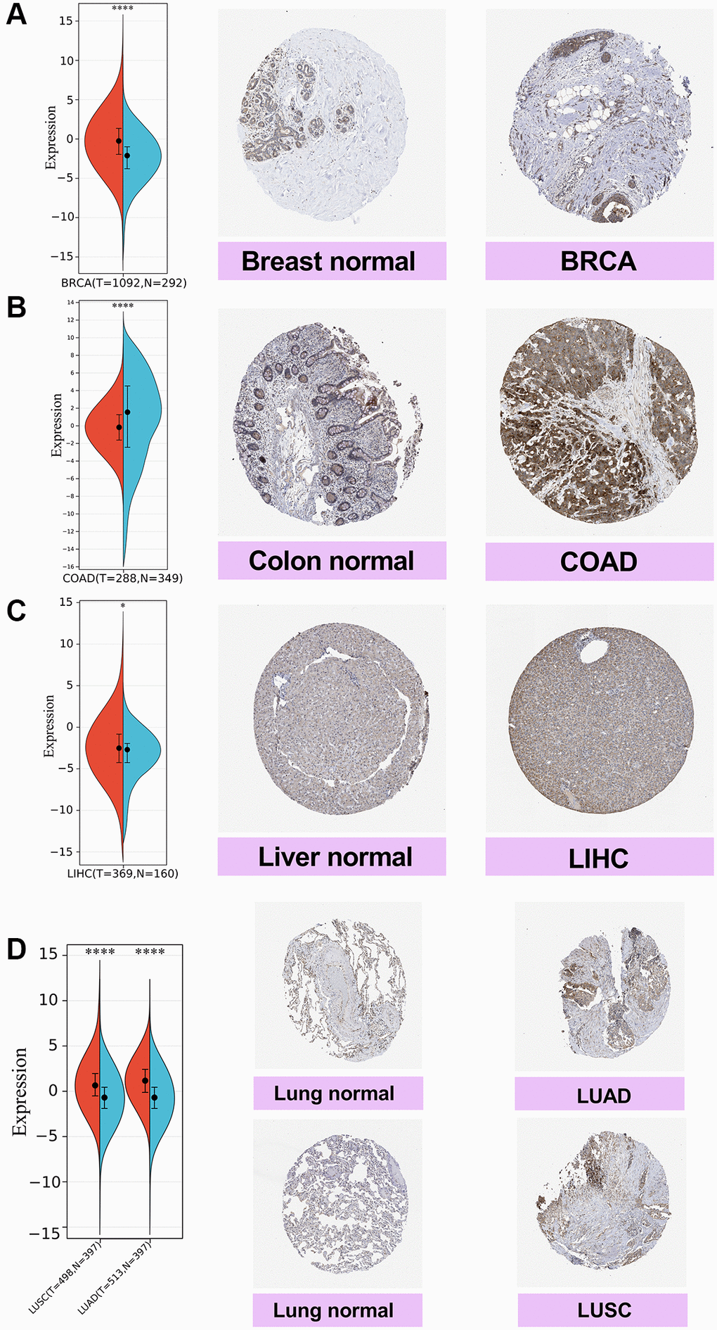 Next, we compared the SPIB gene expression from the TCGA database with the Immunohistochemistry (IHC) results from the HPA database. The results showed negative SPIB expression in normal breast and liver tissues, while tumor tissues showed moderate IHC staining (Figure 2A, 2C). SPIB staining was weak in normal colon tissues, while tumor tissues exhibited strong IHC staining (Figure 2B). In addition, SPIB staining was weak in normal lung tissue, while tumor tissue exhibited moderate staining (Figure 2D). Taken together, these results illustrate the consistency of the TCGA and HPA database results.