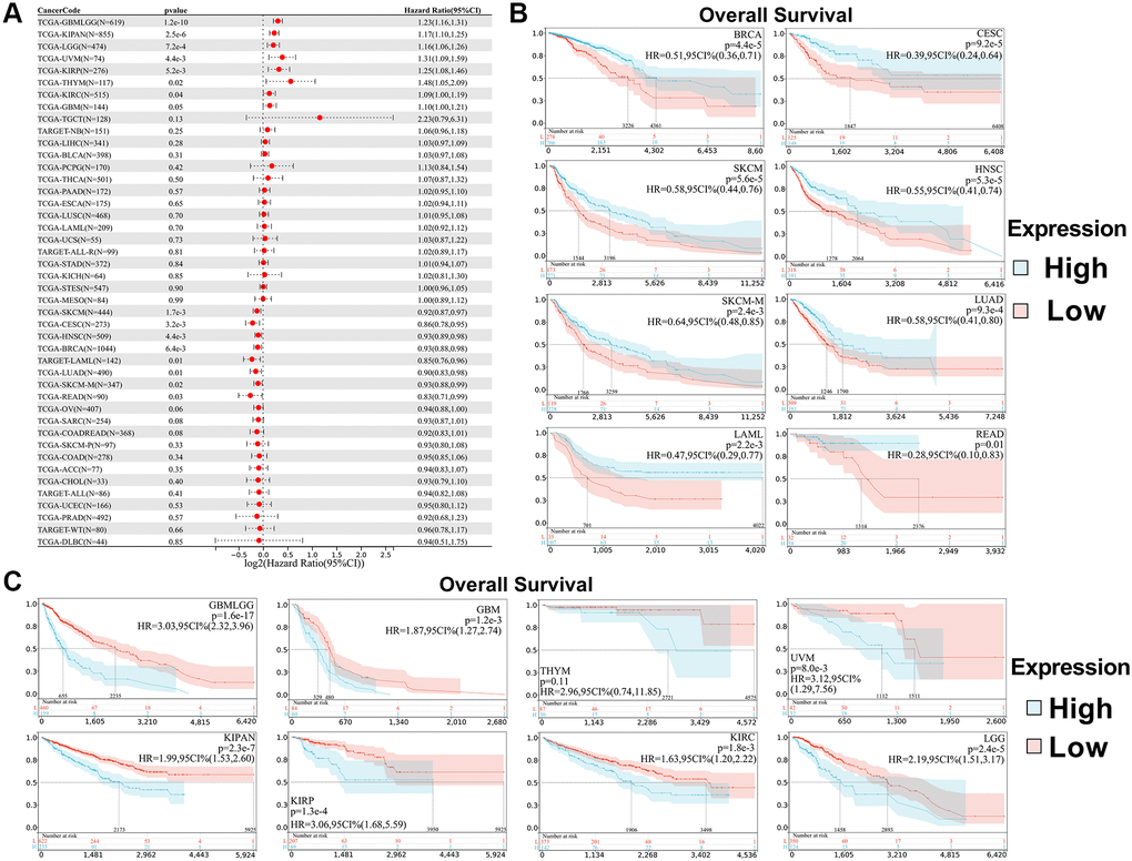 We used the coxph function of the R package surv (version 3.2-7) to build a Cox proportional hazards regression model, analyze the prognostic relationship between SPIB expression and prognosis in each tumor, and obtain prognostic significance using a statistical test by Log-rank test [20]. The results showed that SPIB expression affected overall survival (OS) in patients with 16 cancer types, including GBMLGG, LGG, KIRP, KIPAN, GBM, KIRC, THYM, UVM, LAML, BRCA, CESC, LUAD, HNSC, SKCM, SKCM-M, and READ (Figure 3A). In addition, Kaplan-Meier survival analysis showed that reduced SPIB expression correlated with poor OS in LAML, BRCA, CESC, LUAD, HNSC, SKCM, SKCM-M, and READ (Figure 3B). Meanwhile, increased SPIB expression correlated with a poor OS in GBMLGG, LGG, KIRP, KIPAN, GBM, KIRC, THYM, and UVM (Figure 3C).