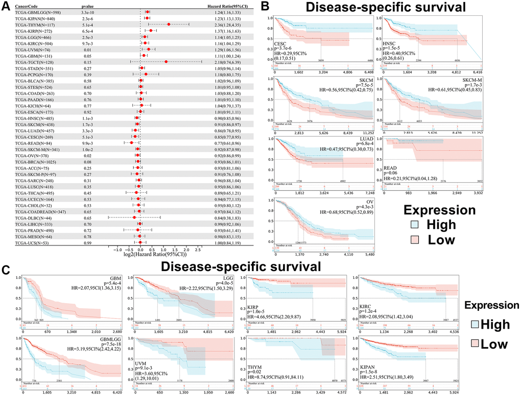 In addition, we analyzed the correlation between SPIB expression and patient DSS. The results showed that SPIB expression affected Disease-Specific Survival (DSS) in 15 cancer types, including GBMLGG, LGG, KIRP, KIPAN, GBM, KIRC, THYM, UVM, CESC, LUAD, HNSC, SKCM, SKCM-M, READ, and OV (Figure 4A). Kaplan-Meier analysis indicated that decreased SPIB expression correlated with a poor prognosis in CESC, LUAD, HNSC, SKCM, SKCM-M, READ, and OV, whereas increased SPIB expression was associated with poor prognosis in GBMLGG, LGG, KIRP, KIPAN, GBM, KIRC, THYM, and UVM (Figure 4B, 4C).
