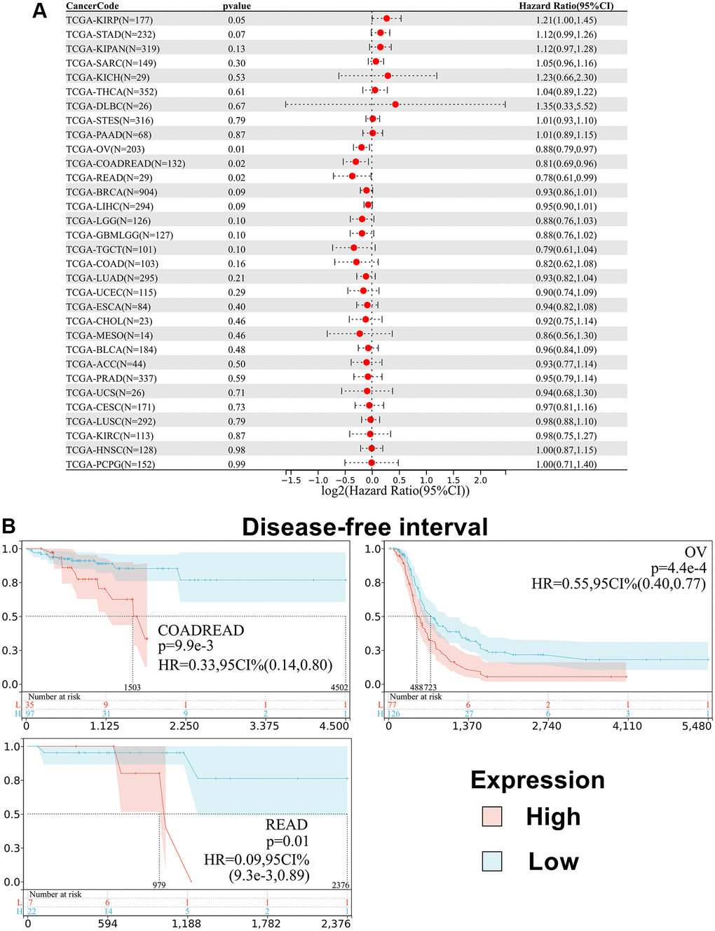 Besides, we analyzed the relationship between SPIB expression and patient Disease-Free Interval (DFI). The results showed that SPIB expression affected DFI in patients with 3 cancer types, including COADREAD, OV, and READ (Figure 5A). Kaplan-Meier analysis showed that reduced SPIB expression correlated with a poor prognosis in COADREAD, OV, and READ (Figure 5B).