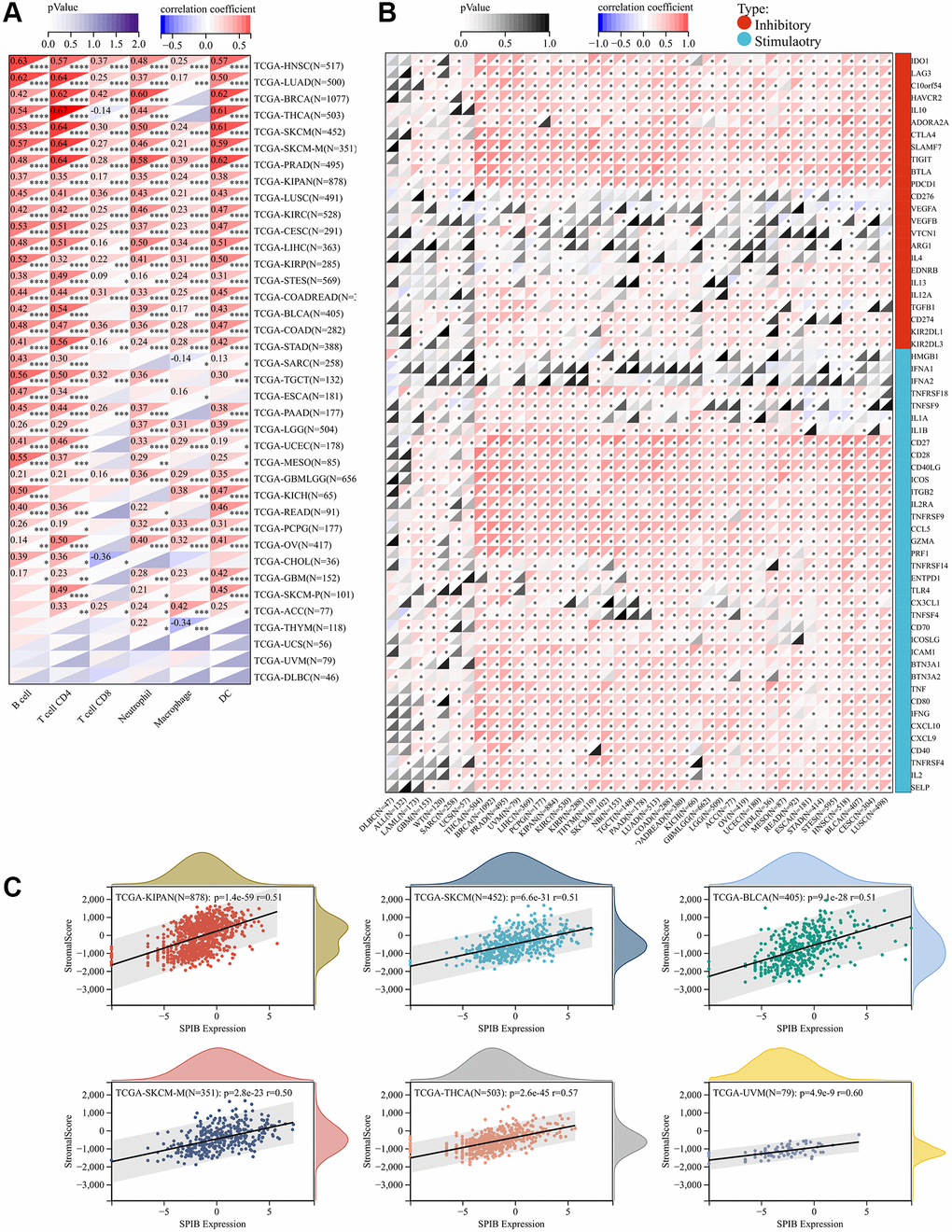 The correlation between SPIB expression and the level of immune cell infiltration was analyzed using the gene expression module of the TIMER2.0 database (http://timer.comp-genomics.org/) [21]. Immune cell types included B cell, CD4 T cell, CD8 T cell, neutrophil, macrophage, and dendritic cell (DC); the analysis results are shown in Supplementary Table 3. Spearman's correlation analysis was used to assess the relationship between SPIB expression and expression levels of immune checkpoint markers. Sixty markers were identified, including inhibitory (n = 24) and stimulatory (n = 36) markers. In addition, we analyzed the relationship between SPIB expression and immune scores, including StromalScore, ImmuneScore, and ESTIMATEScore. Similarly, scatter plots were used to show the top 6 tumors with significant differences, respectively (Supplementary Table 4).
