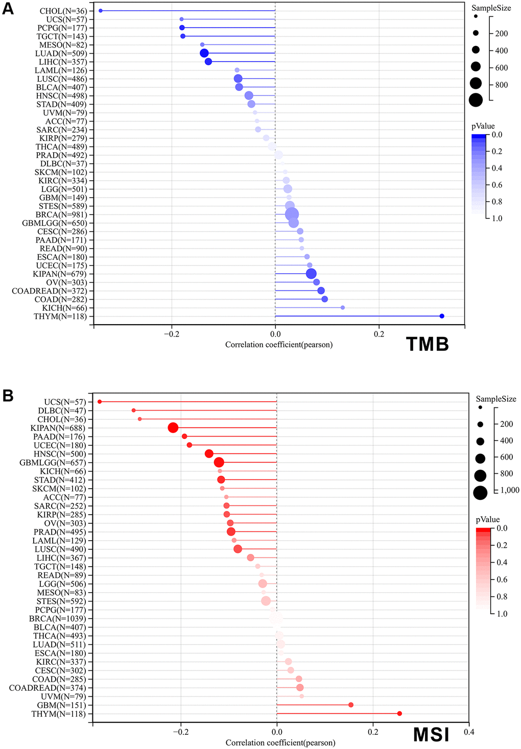 Tumor Mutational Burden (TMB) and Microsatellite Instability (MSI) are well-established as key markers for immunotherapy [23, 24]. Therefore, we evaluated the correlation of SPIB expression with TMB and MSI. The results showed that SPIB expression was correlated positively with TMB of THYM and negatively with TMB of LUAD, LIHC, TGCT, PCPG, and CHOL (Figure 7A). In addition, SPIB expression correlated positively with the MSI of THYM and negatively with the TMB of GBMLGG, KIPAN, STAD, PRAD, UCEC, HNSC, PAAD, UCS, and DLBC (Figure 7B).