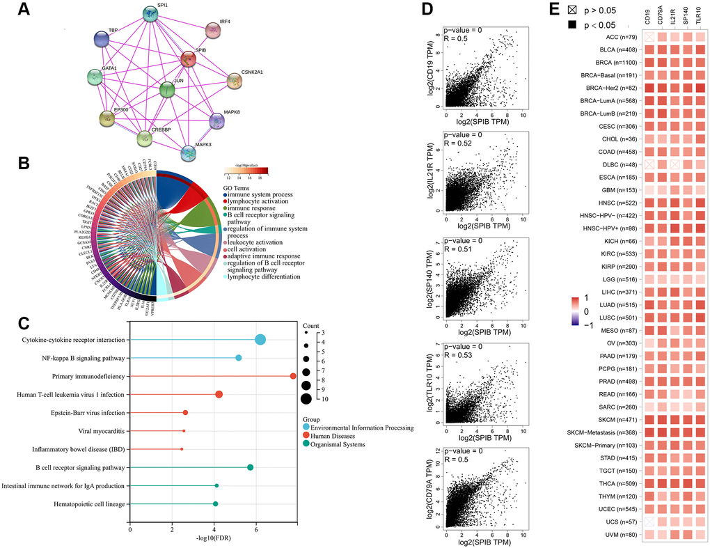 SPIB plays a crucial role in the development of B cells [4]. There is a rich literature available suggesting that SPIB promotes trans-activation of SPI1 to increase glycolytic gene expression and drive the glycolytic process, proliferation, and invasiveness of colon cancer cells [25]. In addition, SPIB is a novel prognostic factor in DLBCL, mediating apoptosis through the PI3K-AKT pathway [26]. Over the years, many studies have linked SPIB to tumors, including lung, gastric, and colorectal cancers. Thus a comprehensive pan-cancer study of SPIB may present a novel perspective on other tumors.