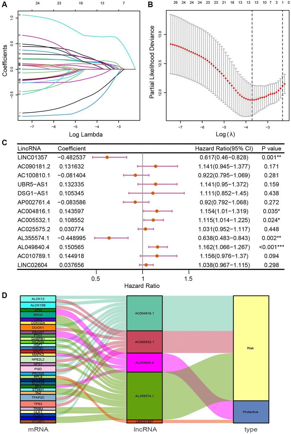 Univariate Cox regression analysis identified 28 prognosis-associated FRLs, which were included into the LASSO regression analysis (Figure 1A, 1B). 5 FRLs (LINC01357, AC004816.1, AC005532.1, AL049840.4 and AL355574.1) were identified for the construction of the risk model using multivariate Cox regression analysis (Figure 1C). Sankey diagram was utilized to demonstrate the relationships among mRNA, FRLs and risk type (Figure 1D). The formula of FRLSG was as follows: FRLSG = (−0.482537 × expressionLINC01357) + (0.143597 × expressionAC004816.1) + (0.108552 × expressionAC005532.1) + (−0.448995 × expressionAL049840.4) + (0.150565 × expressionAL355574.1).