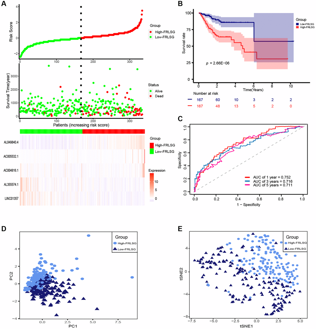 The patient risk survival status plot showed FRLSG was proportional to the number of deceased GC patients (Figure 2A). Kaplan–Meier curve indicated that patients in the high-FRLSG group had worse survival in comparison with those of the low-FRLSG group (P = 2.66E-6, Figure 2B). ROC analysis was utilized to evaluate the prognostic accuracy of FRLSG, and the area under curve (AUC) showed that FRLSG had a reliable ability in predicting survival times for GC patients (1 year AUC = 0.752, 3 years AUC = 0.716, 5 years AUC = 0.711; Figure 2C). In addition, the result of PCA and t-SNE showed distinct division between the high- and low-FRLSG groups based on 5 FRLs (Figure 2D, 2E).