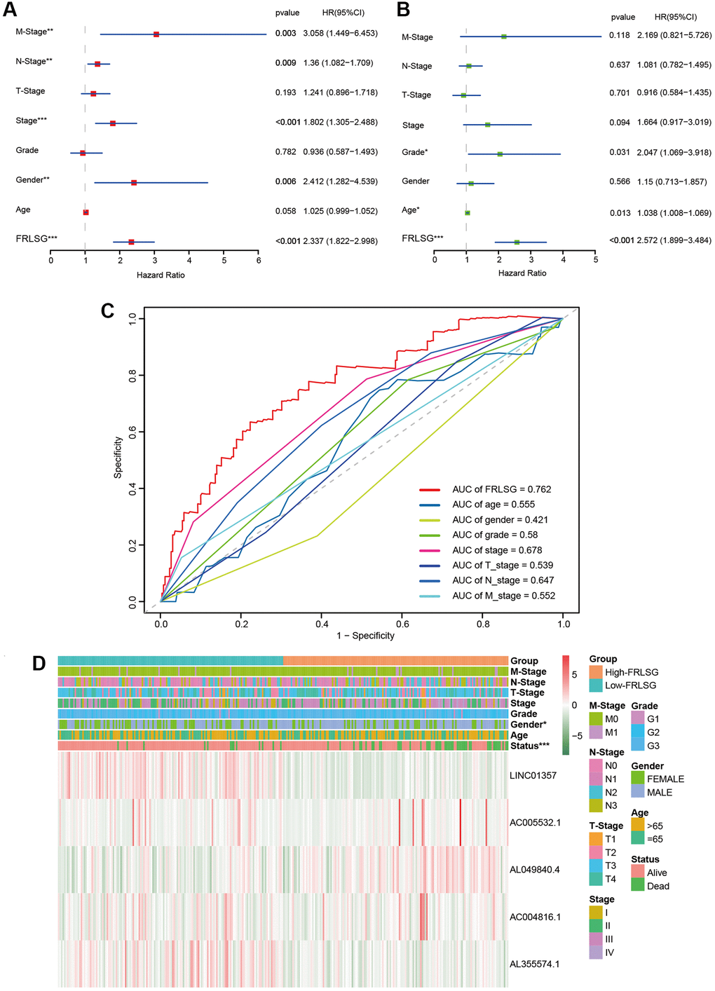 Univariate analysis showed that FRLSG (P < 0.001), gender (P = 0.013), stage (P < 0.001), N-Stage (P = 0.009) and M-Stage (P = 0.003) were independent risk factors for GC patients (Figure 3A). In addition, multivariate analysis further proved that FRLSG (HR = 2.572, 95% CI = 1.899–3.484, P < 0.001), age (HR = 1.038, 95% CI = 1.008–1.069, P = 0.013) and grade (HR = 2.047, 95% CI = 1.069–3.918, P = 0.031) were independent prognostic indicators for GC patients (Figure 3B). Meanwhile, Multi-parameter ROC curve revealed that the AUC value of FRLSG (0.762) was significantly higher than other clinical indicators, indicating that FRLSG had better ability in prognostic prediction (Figure 3C). Furthermore, the heatmap demonstrated the expression of 5 FRLs in the high- and low-FRLSG groups (Figure 3D). Notably, the FRLSG was proved to be tightly associated with gender based on Fisher’s exact probability test (Figure 3D).