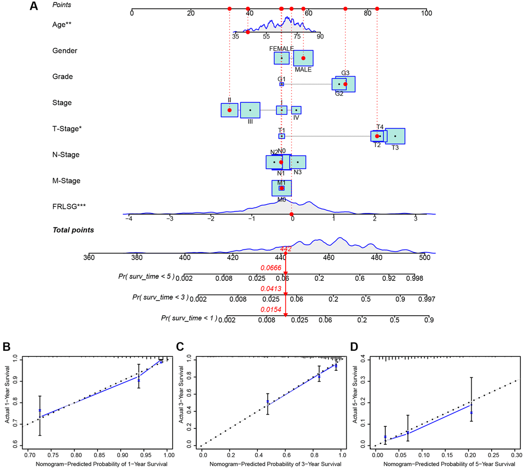 Several clinic-pathological factors and FRLSG were used to construct a hybrid nomogram to improve the prognostic prediction power (Figure 4A). The total points of all factors for each patient could be calculated according to the nomogram, which might provide a novel quantitative tool for clinical practice. The calibration curves showed good performance for the nomogram, suggesting that the nomogram was accurate and reliable in predicting the prognosis for patients with GC (Figure 4B–4D).