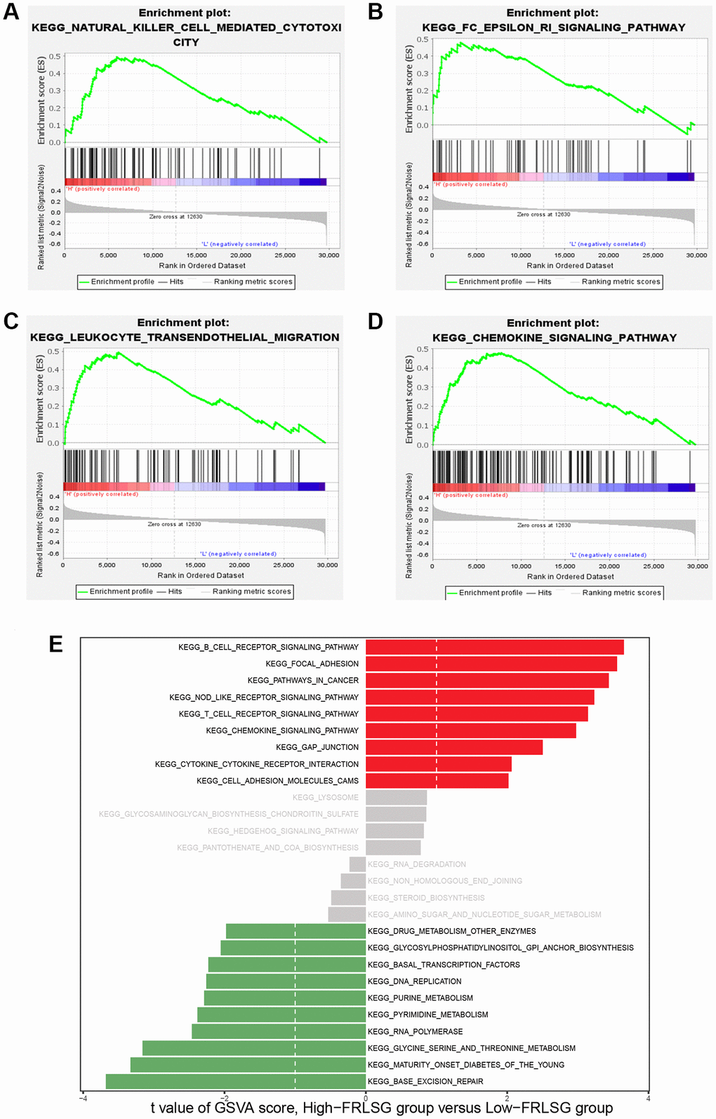 To investigate the pathways associated with FRLSG, we employed GSEA software to conduct KEGG enrichment analysis between the high- and the low-FRLSG groups. The result revealed that a total of 17 pathways (Supplementary Table 3) were significantly enriched in the high-FRLSG group. To our surprise, KEGG analysis demonstrated several immune-related pathways such as natural killer cell mediated cytotoxicity, Fc epsilon RI signaling pathway, leukocyte transendothelial migration and chemokine signaling pathway were enriched in the high-FRLSG group, indicating high immune infiltration status of GC patients with high-FRLSG (Figure 5A–5D). Furthermore, GSVA analysis showed that the high-FRLSG group enriched in many immune-related pathways, such as B cell receptor signaling and chemokine signaling, and CTLA4 associated pathways, such as cell adhesion molecules cams and T cell receptor signaling, which suggested GC patients with high-FRLSG might benefit from immunotherapy and anti-CTLA4 therapy (Figure 5E).