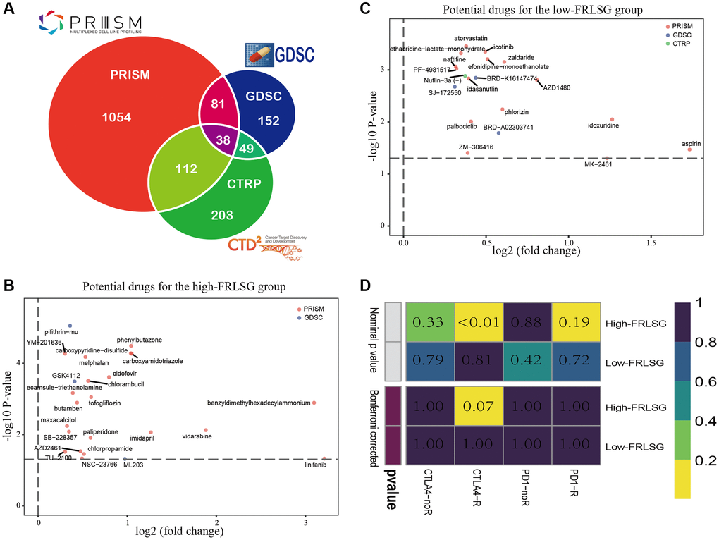 Using subclass mapping, we compared the transcriptome profiles of two GC subclasses separated by FRLSG with another published dataset containing 47 patients with melanoma who received anti-PD-1 and anti-CTLA4 immunotherapy treatment. The result of SubMap analysis suggested that the high-FRLSG patients had higher drug sensitivity to anti-CTLA4 therapy (p < 0.05), which was consistent with the immune- and CTLA4-related pathways enriched in the high-FRLSG group (Figure 7D).