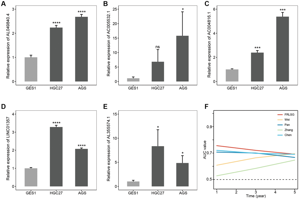 The result of qRT-PCR assay showed AC004816.1, AC005532.1, LINC01357, AL355574.1 and AL049840.4 were overexpressed in HGC27 and AGS compared with GES1, which was consistent with the bioinformatic analyses in our study (Figure 8A–8E). In addition, compared with other four published ferroptosis-related lncRNAs signatures for GC patients, FRLSG demonstrated the highest AUC value, suggesting the priority of FRLSG in prognosis prediction (Figure 8F).