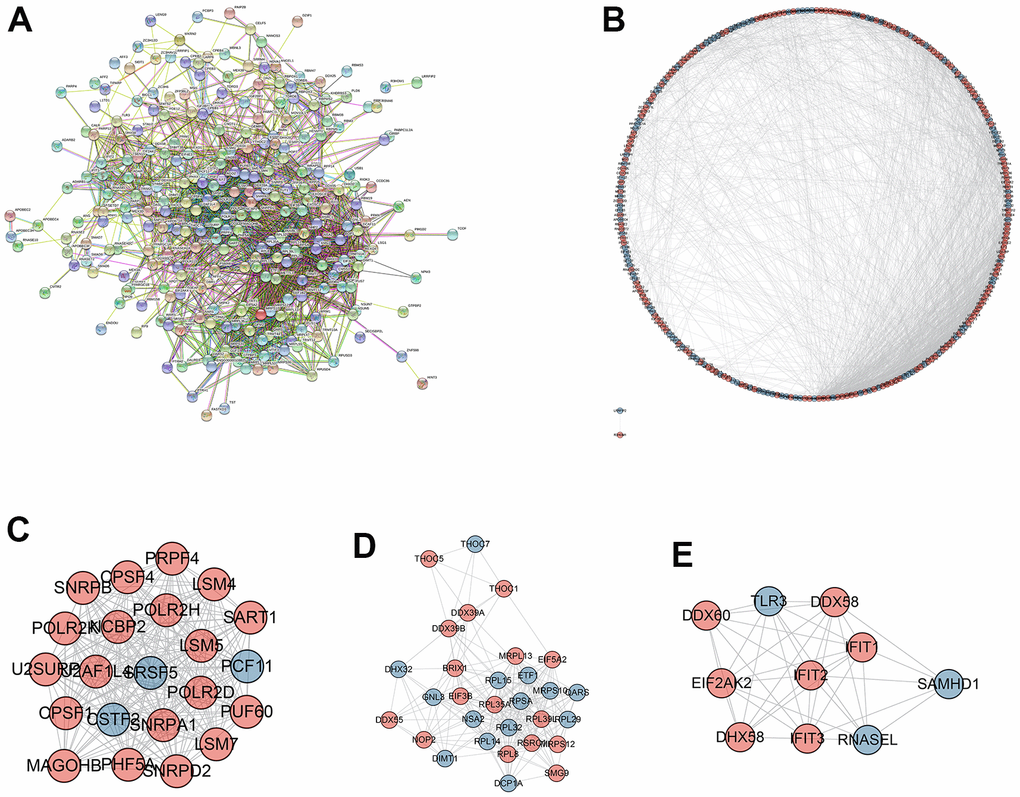 As shown in Figure 3A, 3B, PPI network was established to further screen the hub DERBPs in LSCC. The most three important modules were screened out and shown in Figure 3C–3E. Pathway enrichment analysis of the three key modules showed that the hub DERBPs were related to RNA activities, such as RNA splicing, RNA transport and RNA binding (Supplementary Table 4).