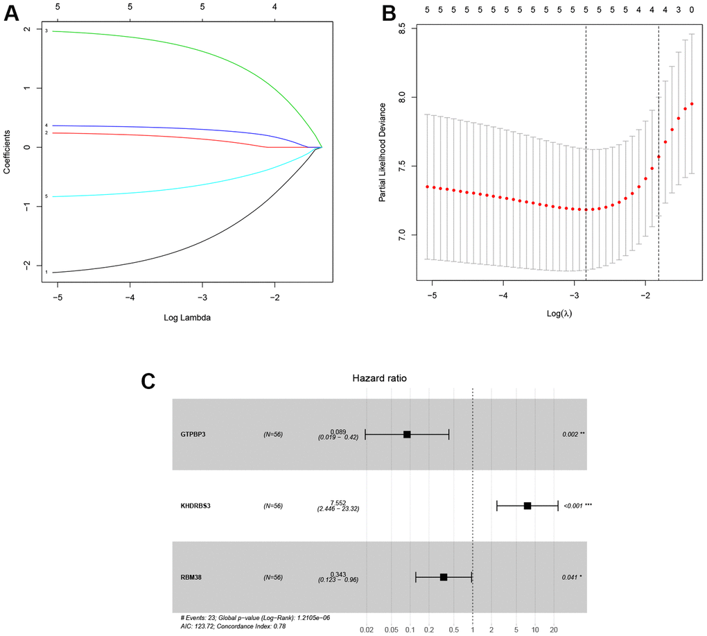 In training cohort, ten RBPs related to prognosis were obtained for the LASSO analysis (Table 2). Next, the LASSO analysis was performed, and the coefficients of five DERBPs are shown in Figure 4. Subsequently, through multivariate Cox regression, three RBPs (GTPBP3, KHDRBS3 and RBM38) were selected to develop the transcriptomic signature for LSCC (Figure 4C and Table 3). The calculation formula of the risk score based on training cohort was described below: