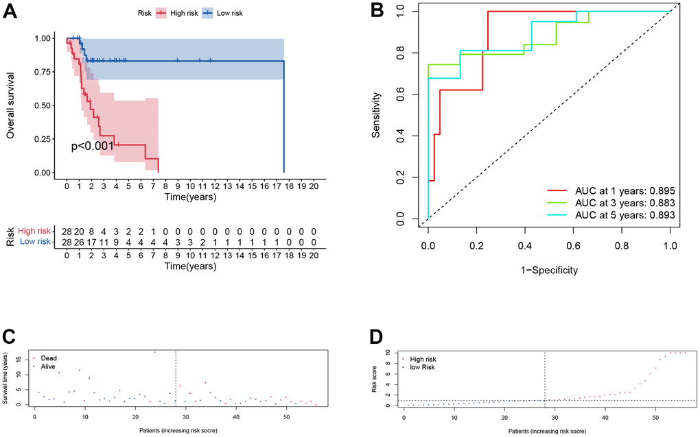 In training cohort, there was a worse prognosis for high-risk group compared with low-risk group (p < .001, Figure 5A). The one-, three-, and five-years AUC values of the signature was 0.895, 0.883 and 0.89 (Figure 5B), indicating great diagnostic capability of the prognostic signature. The survival status of patients and risk score of the signature consisting of the three DERBPs in the low- and high-risk subgroups were shown in Figure 5C, 5D.