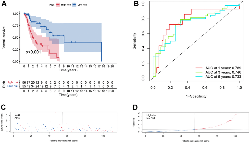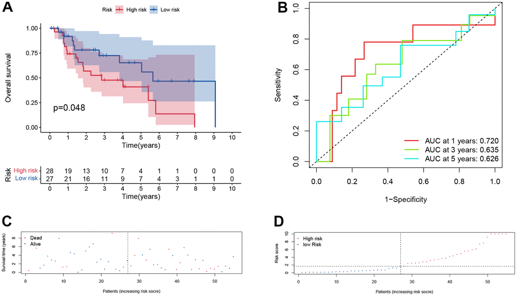 Furthermore, the same analysis methods were applied in different cohorts, including test cohort (n=55), entire cohort (n=111), GSE65858 cohort (n=270) and GSE27020 cohort (n=109). In test cohort, patients with a higher risk score also had a worse overall survival than those with a lower risk score (p = 0.048, Figure 6A) and entire cohort (p < .001, Figure 7A). The Time-dependent AUC values of test cohort and entire cohort were plotted in Figures 6B, 7B. In GSE27020 cohort, patients with higher risk score were more likely to have a worse disease-free survival compared with patients in the lower risk score (p = 0.011, Supplementary Figure 1A). The Time-dependent AUC values of GSE27020 cohort were plotted in Supplementary Figure 1B. In GSE65858 cohort (n=270), patients with a higher risk score also had a worse overall survival (p = 0.147, Supplementary Figure 2A). The AUC values of the GSE65858 cohort was displayed in Supplementary Figure 2B. As shown in Supplementary Figure 2C, 2D, patients with higher risk score had a higher mortality.