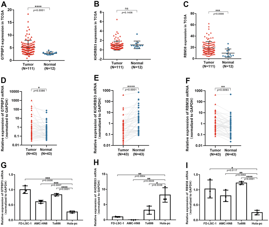 In clinical tissues, higher GTPBP3 and RBM38 expression were found in LSCC tissues, while lower KHDRBS3 expression was found (Figure 8D–8F), which was consistent with the results of differential expression analysis from TCGA (Figure 8A–8C). In cell lines, the same results were noted. (Figure 8G–8I).