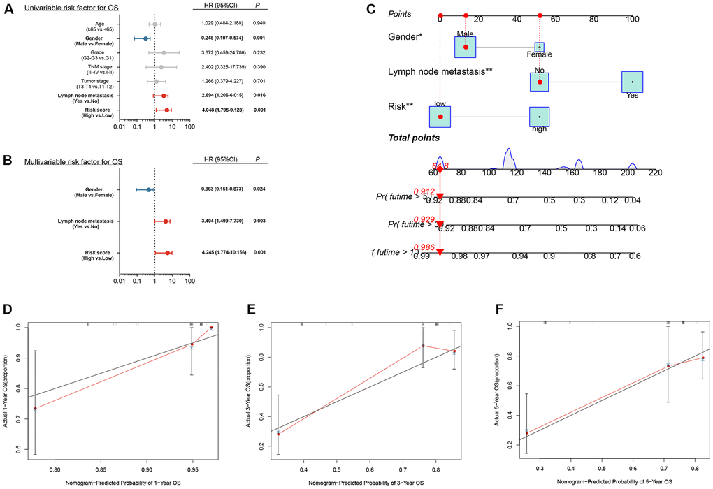 Univariate and multivariate Cox regression analysis suggested that gender, lymph node metastasis and risk score were independent prognostic factors of LSCC patients (p < .05, Figure 9A, 9B). These results suggested that the risk score calculated by transcriptomic signature was an independent risk factor for patients with LSCC.