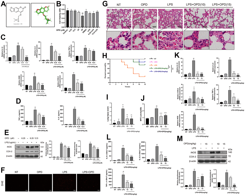 Oxypeucedanin was purchased from Shanghai Yuanye Biological Co., Ltd. (China), was HPLC ≥ 98%, and was dissolved in sterile DMSO solvent. The mice were administered doses by intraperitoneal injection at 10 and 15 mg/kg concentrations. In the pretreatment groups, mice received a single dose of OPD 1 h before LPS was administered. The LPS and NT groups were treated with the same dosage of solvent. OPD was used to stimulate RAW264.7 cells in vitro at concentrations of 6.25 and 12.5 μM.
