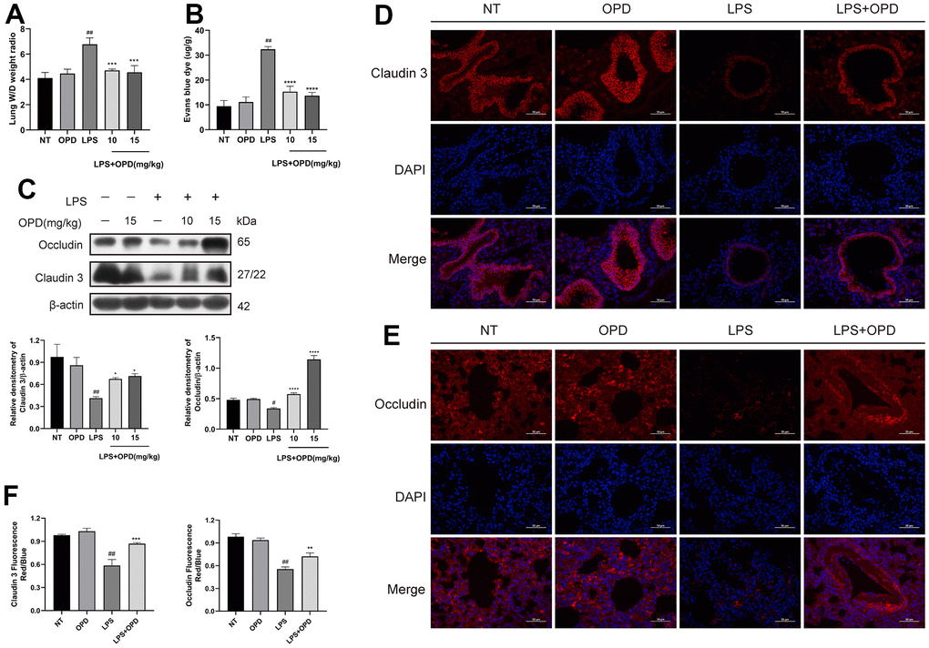 To some extent, the formation of pulmonary edema reflects the increased permeability of alveolar endothelial cells and pulmonary capillaries, so we determined the lung wet/dry weight ratio. The results showed that OPD treatment alone did not cause pulmonary edema (Figure 2A). However, LPS significantly disrupted the pulmonary capillary barrier, causing pulmonary edema. Surprisingly, OPD reversed the above disease phenotypes in a dose-dependent manner (Figure 2A).