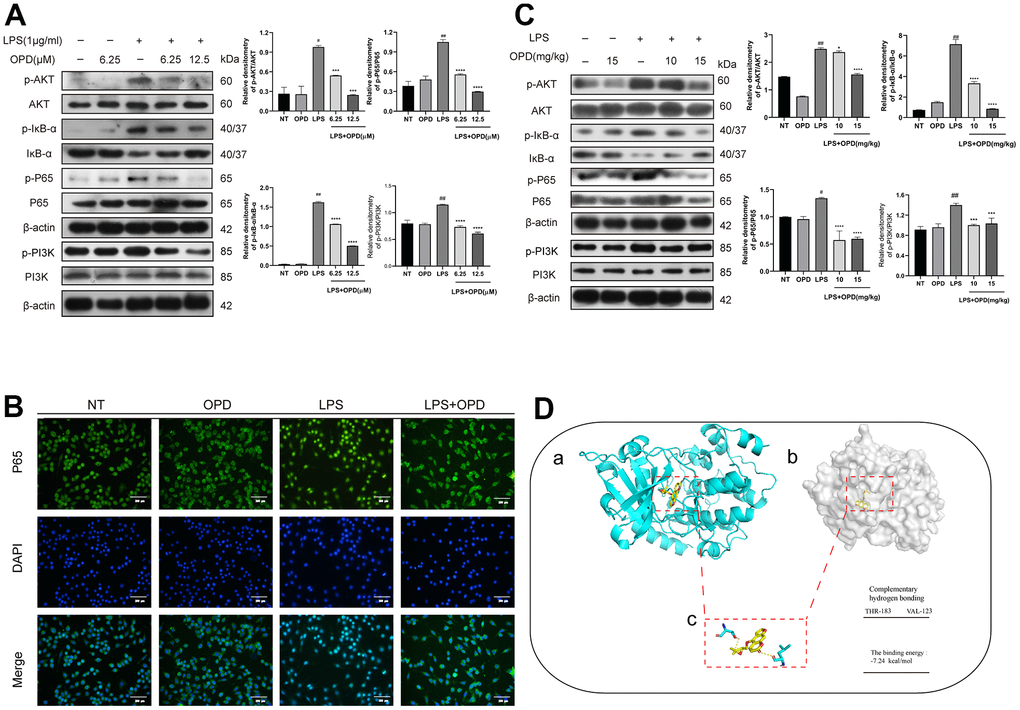 To further verify the above results, we examined the PI3K/AKT and NF-κB signaling pathways by Western blotting in LPS-induced mice, and the results were consistent with the in vitro results as follows: there was no difference in the phosphorylation levels of PI3K/AKT, P65 and IκB proteins or the ubiquitinated degradation of IκB proteins in the OPD-treated group alone compared to the NT group (Figure 3C). However, LPS significantly increased the phosphorylation levels of AKT, P65, and IκB proteins as well as the ubiquitinated degradation of IκB proteins (Figure 3C). Encouragingly, OPD reversed the LPS-induced phosphorylation levels of AKT, P65, and IκB proteins and the ubiquitinated degradation of IκB proteins (Figure 3C). This result is also consistent with the results of the in vitro experiments described above and suggests that inhibiting the elevated levels of phosphorylation of PI3K/AKT/NF-κB signaling is a potential therapeutic means for OPD to alleviate ALI.