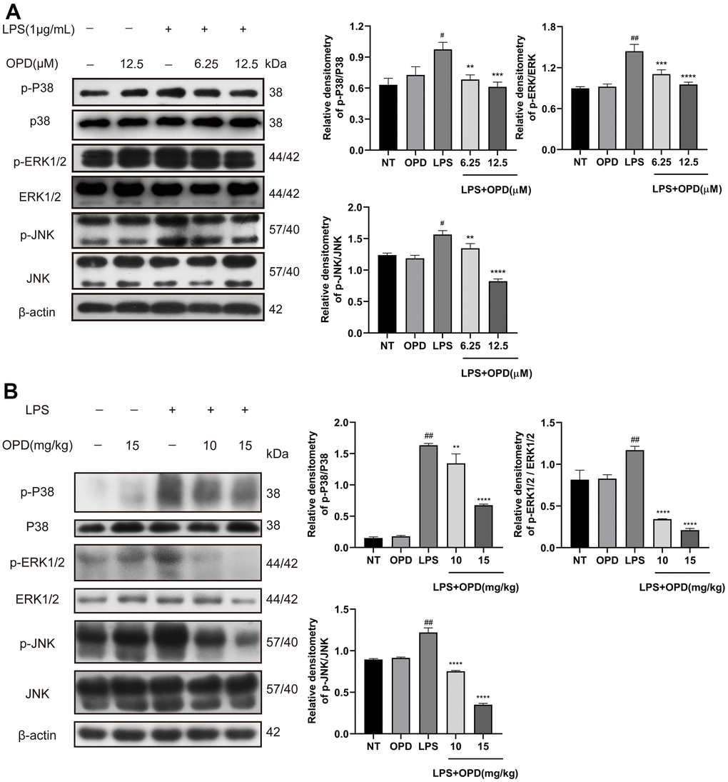 Then, we performed further validation tests in LPS-treated mice. Similarly, there was no difference in the phosphorylation levels of P38, ERK1/2, and JNK between the OPD treatment group alone and the NT group (Figure 4B). However, LPS significantly increased the phosphorylation levels of P38, ERK1/2, and JNK (Figure 4B). OPD reversed the LPS-induced increase in the phosphorylation levels of P38, ERK1/2, and JNK (Figure 4B). The results were also the same as the above in vitro experiments and further indicated that inhibiting the increase in the phosphorylation level of the MAPK signaling pathway is a potential therapeutic approach for OPD to alleviate ALI.