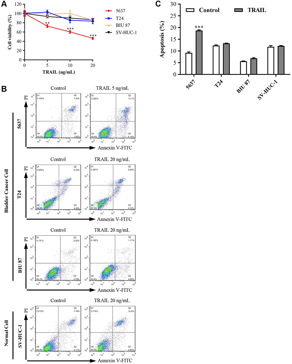 To determine the effects of TRAIL on the viability of bladder cancer cells, the CCK8 was used to detect cell viabilities. Bladder normal epithelial cell (SV-HUC-1) and bladder cancer cell lines (5637, T24, and BIU 87) were treated with different concentrations of TRAIL (0, 5, 10, and 20 ng/mL) for 24 h and then cell viabilities were measured. The results showed that 5 ng/mL of TRAIL significantly inhibited the proliferation of 5637 cells (72.67 ± 6.03); however, 5 ng/mL of TRAIL did not affect cell proliferation in T24 cells (103.00 ± 4.36), BIU 87 cells (98.36 ± 7.84) and SV-HUC-1 cells (88.00 ± 2.65) (Figure 2A). Subsequently, we investigated the effect of TRAIL on cell apoptosis. The results showed that apoptotic cells significantly increased in 5637 cells after treatment with 5 ng/mL TRAIL for 24 h. Meanwhile, no significant change was observed in apoptosis of bladder cancer cells (T24 and BIU 87) or bladder epithelial cells SV-HUC-1 (Figure 2B and 2C). Even when treated with higher concentrations of TRAIL (20 ng/mL), cell viability and apoptosis did not change significantly (Figure 2A–2C). Based on these results, T24, BIU 87, and SV-HUC-1 cells were regarded as intrinsic resistant to TRAIL.
