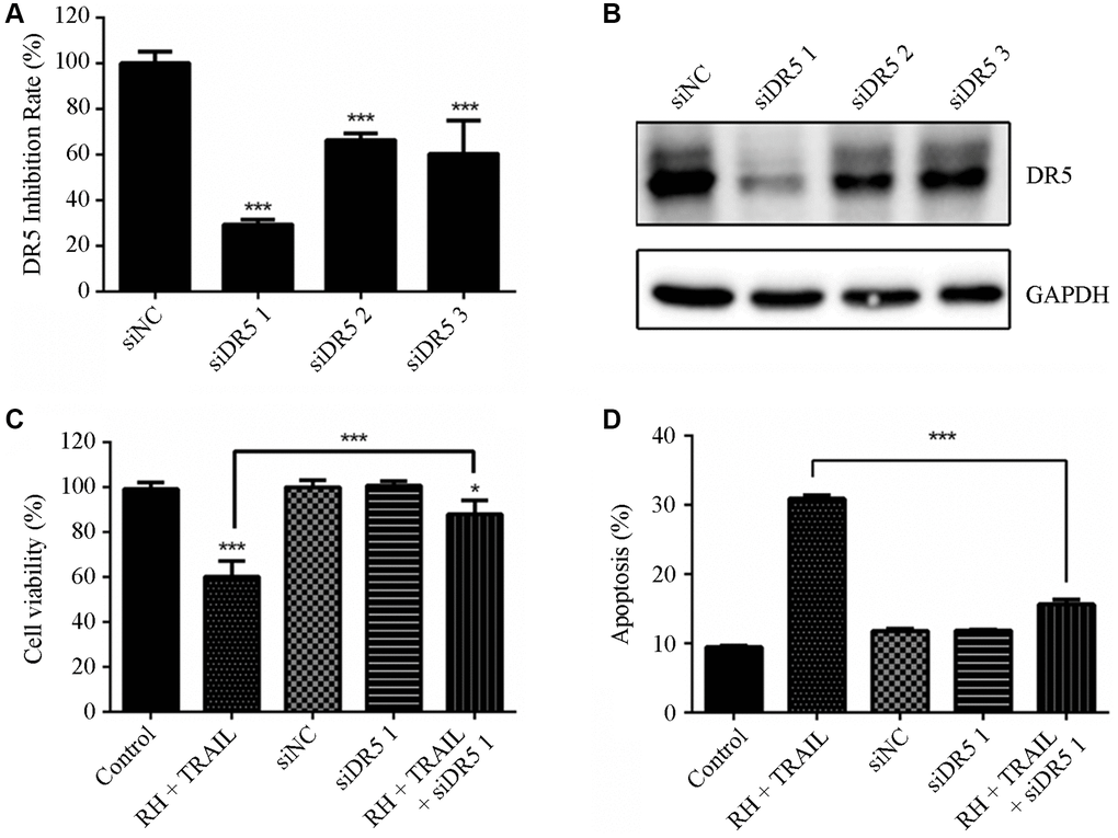 To validate the role of DR5 in the sensitization of TRAIL-resistant cells after treatment with RH, we designed and synthesized three small interfering RNAs targeting DR5 (named siDR5 1, siDR5 2 and siDR5 3, respectively) (Supplementary Table 2). Next, we transfected the TRAIL-resistant BIU 87 cells with the siRNAs for 24 h. Results showed that siDR5 1 significantly inhibited DR5 mRNA and protein expression (Figure 6A and 6B). Figure 6C and 6D showed that TRAIL-induced cytotoxicity and apoptosis were both inhibited in siDR5 1 transfected cells (BIU 87). Therefore, DR5 is likely to be a key molecule in RH induced sensitization of TRAIL-resistant cells.