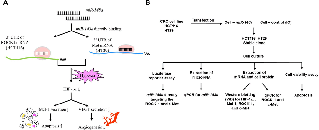 In this current study, we supposed that miR-148a directly targets ROCK1 and c-Met to decrease angiogenesis and increase the apoptosis of colon cancer cells by inhibiting the secretion of VEGF and Mcl-1 through downregulation of HIF-1α under hypoxia. We also searched out the potential synergistic effects of the combination of miR-148a and bevacizumab.