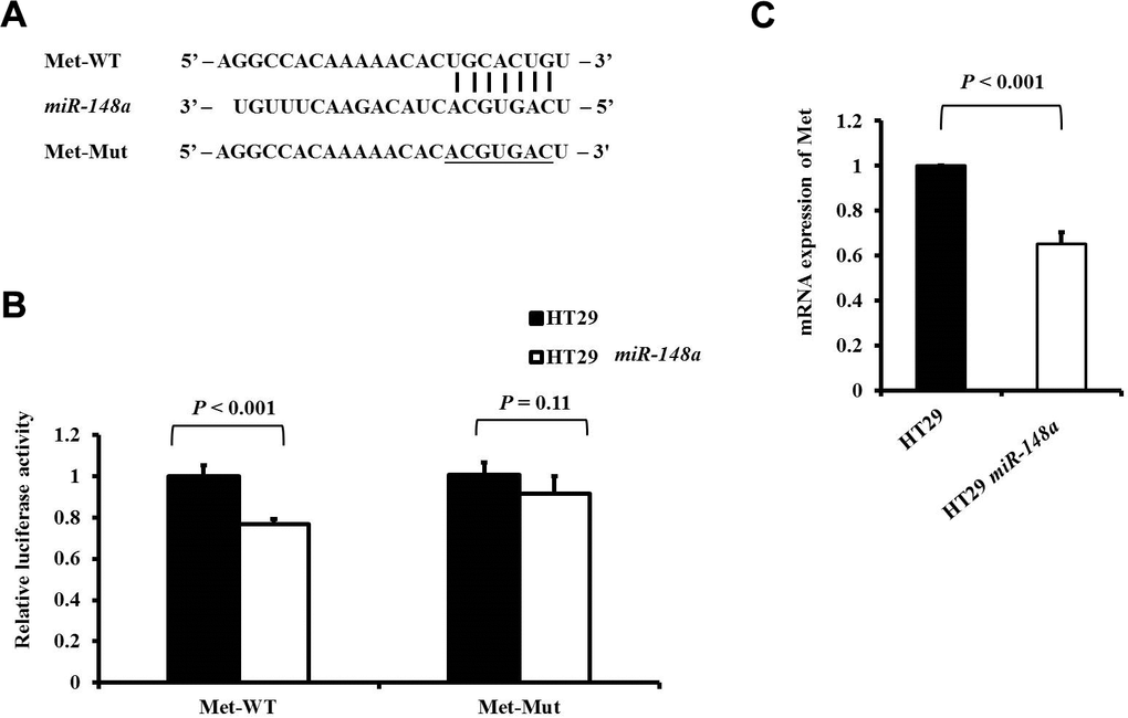 Met, a tyrosine kinase receptor for hepatocyte growth factor (HGF), plays an important role in HGF/Met/Snail signaling in the EMT and metastasis [27, 28]. The wild-type or mutant 3′-UTR fragments of Met were cloned downstream of the firefly luciferase gene to determine whether Met is a direct target of miR-148a (Figure 2A). It demonstrated by a luciferase reporter assay that the overexpression of miR-148a in the HT29 cell line significantly attenuated firefly luciferase activity relative to that in the cell line transfected with the wild-type 3′-UTR of Met (P < 0.001; Figure 2B), when the predicted 3′-UTR-binding site was mutated and the effect was abolished (P = 0.11; Figure 2B). A comparison of the mRNA expression of c-Met between the HT29 cells and HT29-miR-148a cells revealed that miR-148a remarkably downregulated the expression of c-Met mRNA (P < 0.001; Figure 2C) in the HT29-miR-148a cells.