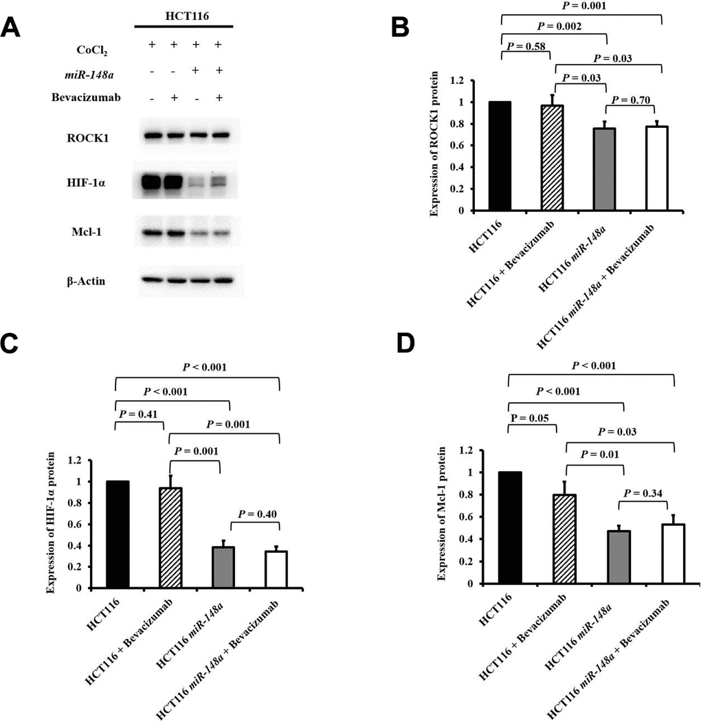 To examine the functions of miR-148a on the activation of ROCK1, HIF-1α, and Mcl-1 under hypoxia, we analyzed the protein expression of ROCK1, HIF-1α, and Mcl-1 in the HCT116, HCT116 + bevacizumab, HCT116-miR-148a, and HCT116-miR-148a + bevacizumab cell lines, separately. The protein expression of ROCK1 was significantly decreased in the HCT116-miR-148a cells compared with that in the HCT116 cells (Figure 3A, 3B, P = 0.002), but not in the HCT116 + bevacizumab cells (P = 0.58, Figure 3A, 3B). Similarly, the protein expression of HIF-1α and Mcl-1 (all P < 0.001; Figure 3A, 3C, 3D) was markedly decreased in the HCT116-miR-148a cells, but not in the HCT116 + bevacizumab cells (HIF-1α: P = 0.41 and Mcl-1: P = 0.05; Figure 3A, 3C, 3D).