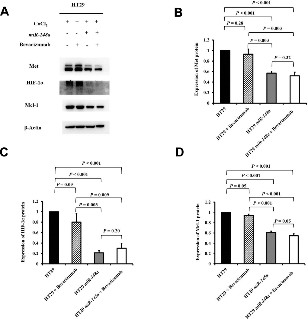To research the effect of miR-148a on the activation of Met, HIF-1α, and Mcl-1 under hypoxia, we further studied the protein expression of Met, HIF-1α, and Mcl-1 in the HT29, HT29 + bevacizumab, HT29-miR-148a, and HT29-miR-148a + bevacizumab cell lines separately. The protein expression of Met was significantly decreased in the HT29-miR-148a cells compared that in with the HT29 cells (Figure 4A, 4B, P < 0.001), but not in the HT29 + bevacizumab (P = 0.28, Figure 4A, 4B). Similarly, the protein expression of HIF-1α and Mcl-1 (all P < 0.001; Figure 4A, 4C, 4D) was significantly decreased in the HT29-miR-148a cells, but not in the HCT29 + bevacizumab cells (HIF-1α: P = 0.09 and Mcl-1: P = 0.05; Figure 4A, 4C, 4D).
