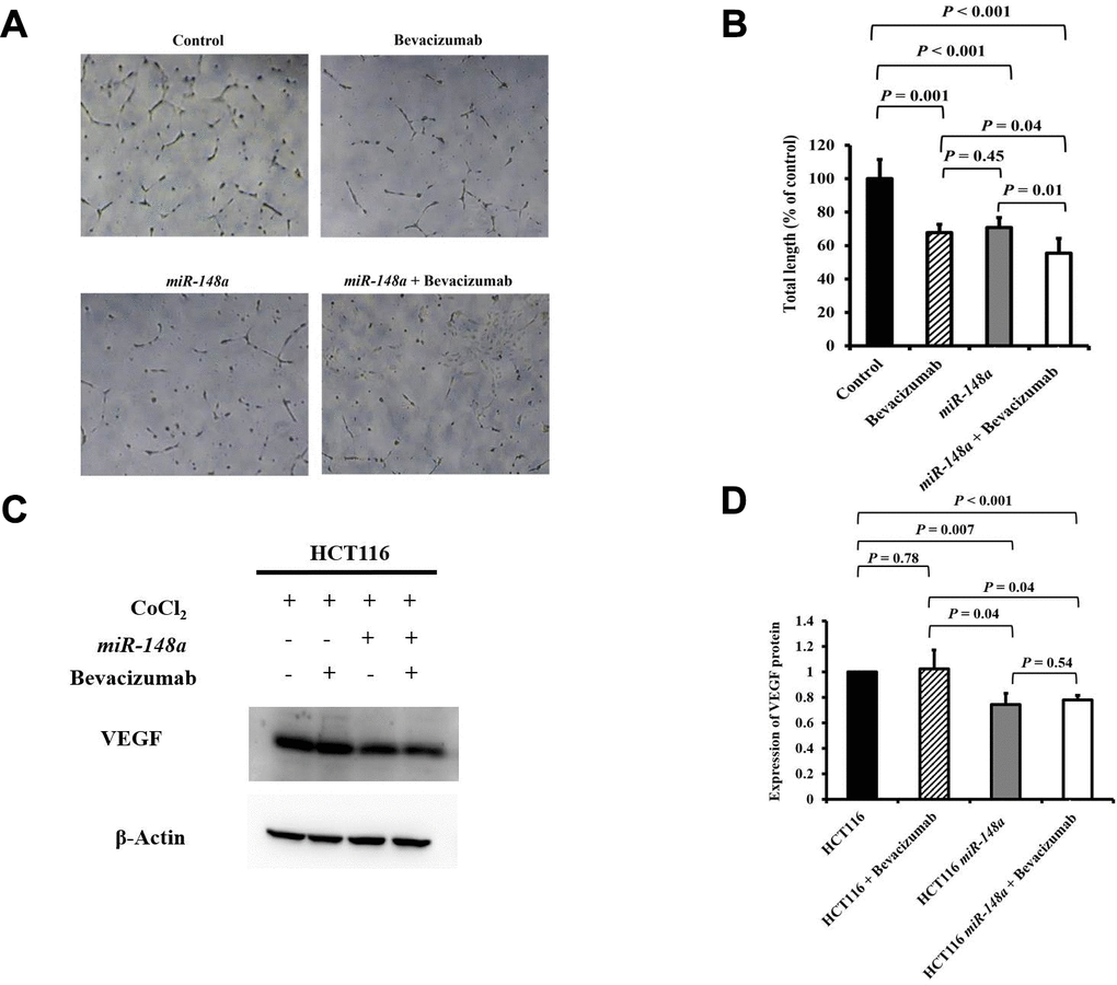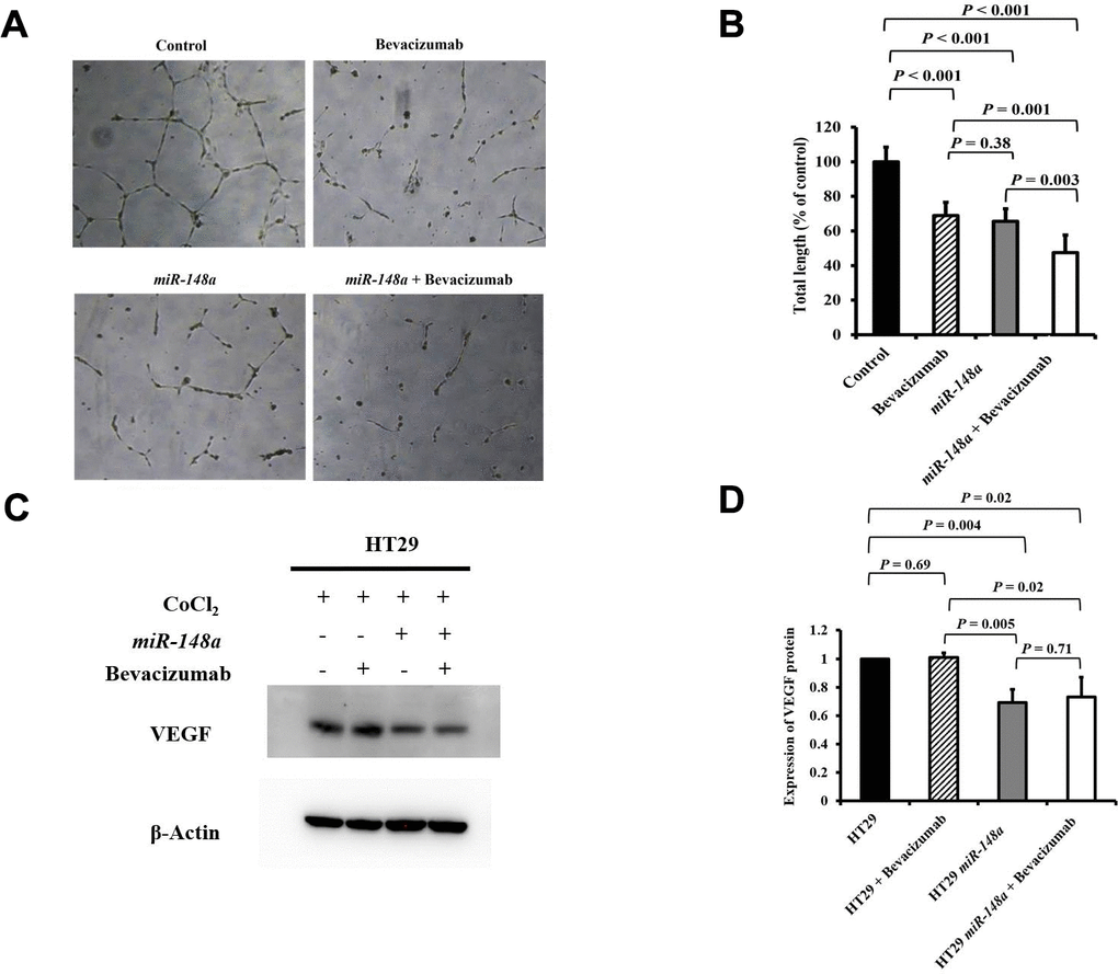 For the nonhypoxic and hypoxic culture condition, we discovered that miR-148a uncommonly inhibited the expression of HIF-1α and VEGF in HCT116 cells (nonhypoxic: P = 0.028 and 0.0005; hypoxic: P = 0.0007 and 0.02 respectively; Supplementary Figure 2A) and in HT29 cells (nonhypoxic: P = 0.0006 and 0.0014; hypoxic: P = 0.045 and 0.02, respectively; Supplementary Figure 2B). The antiangiogenesis ability of miR-148a was investigated through a tube formation assay in human umbilical vein endothelial cells (HUVECs), and the inhibition of VEGF secretion was assessed through Western blotting. Tube formation was significantly inhibited in the HCT116 cells + bevacizumab group (P = 0.001, Figure 5A, 5B), HT29 cells + bevacizumab group (P < 0.001, Figure 6A, 6B), HCT116-miR-148a cells (P < 0.001, Figure 5A, 5B), and HT29-miR-148a cells (P < 0.001, Figure 6A, 6B). Moreover, miR-148a significantly suppressed VEGF secretion in the HCT116-miR-148a (P = 0.007, Figure 5C, 5D) and HT29-miR-148a (P = 0.004; Figure 6C, 6D) cells, but bevacizumab did not significantly inhibit VEGF secretion in the HCT116 cells + bevacizumab group (P = 0.78, Figure 5C, 5D) or HT29 cells + bevacizumab group (P = 0.69, Figure 6C, 6D).