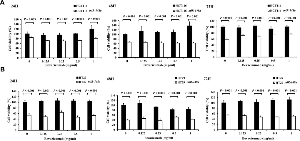 miR-148a remarkably inhibited cell viability regardless of the concentrations of bevacizumab at 24, 48, and 72 h (all P < 0.001; Figure 7). This result indicated the miR-148a alone could directly suppress the proliferation of colon cancer cells.