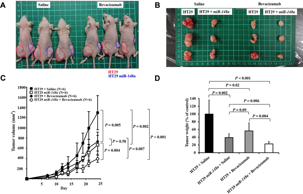 We further validated the role of miR-148a in anti-tumorigenesis and evaluated the effect of miR-148a overexpression on tumor growth in vivo. Six-week-old male Balb/c nude mice were purchased from BioLASCO Taiwan, Co., Ltd. (Taipei, Taiwan) and were maintained in the Center for Laboratory Animals of Kaohsiung Medical University. At 8 weeks of age, the mice were subcutaneously injected with miR-148a overexpression and NC clones with scrambled pCDH-NC for tumor growth (red circle: NC; blue circle: miR-148a overexpression). Each mouse received two subcutaneous injections of 1 × 107 HT29 cells (either pCDH-negative or pCDH–miR-148a) into the bilateral flank for the implantation of two tumors. One week after implantation, the mice were assigned into two groups—saline only or bevacizumab. The mice received an intraperitoneal injection of bevacizumab (2.5 mg/kg) (Roche) or an equal volume of saline twice per week. The tumor diameter was measured, and tumor volume was calculated using the following formula: V = (length × width2)/2. After the tumor-bearing mice were sacrificed at 3 weeks after tumor cell seeding, tumor burdens were analyzed. All animal experiments were performed in an Association for Assessment and Accreditation of Laboratory Animal Care International-accredited facility. The animal handling procedures were in accordance with the protocols approved by the Institutional Animal Care and Use Committee of Kaohsiung Medical University (IACUC Approval No: 108165).