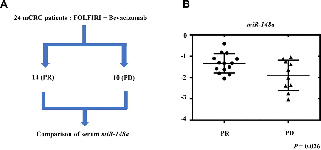 To evaluate the role of miR-148a expression in mCRC patients treated with bevacizumab, we collected the serum samples of 24 mCRC patients before they received bevacizumab plus FOLFIRI as the first-line treatment. Among these patients, 14 showed a partial response (PR), and 10 had progressive disease (PD) (Figure 9A). The patients who exhibited PR had significantly higher serum miR-148a expression than those who had PD (P = 0.026, Figure 9B). This result indicated that mCRC patients who exhibited miR-148a overexpression receiving bevacizumab plus FOLFIRI had a more favorable treatment response than those with lower miR-148a expression.