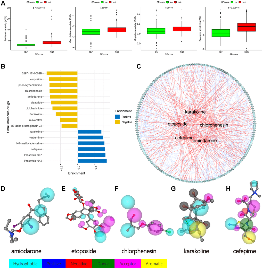 We identified four chemotherapy drugs and estimated IC50 levels. As shown (Figure 10A), all four exhibited significantly low IC50 levels in the low SFscore group, including paclitaxel (p < 2.22e-16), cisplatin (p < 8.2e-10), docetaxel (p < 2.22e-16), and gemcitabine (p < 7.3e-09). Thus, low SFscore patients were more sensitive to the ten selected drugs. To further screen for specific drugs for patients with distinct SFscore, we analyzed DEGs between groups with distinct SFscore, including 111 up- and 106 down-regulated genes. DEGs were uploaded to the CMap database, and 16 small molecule drugs were identified (p < 0.01, |mean|>0.4) (Figure 10B). Among these, ten drugs targeting lower SFscore patients were selected with negative enrichment and six small molecule drugs were selected for higher SFscore patients (with positive enrichment). Amiodarone (p = 0.00056, enrichment = −0.809), etoposide (p = 0.00123, enrichment = −0.837), chlorphenesin (p = 0.00185, enrichment = −0.824), karakoline (p = 0.00201, enrichment = −0.699), and cefepime (p = 0.00277, enrichment = 0.804) were identified, and a network constructed to identify drug interactions with target proteins (Figure 10C). Also, druggable pharmacophore models of these five aforementioned drugs were analyzed and visualized in PharmMapper (Figure 10D–10H).