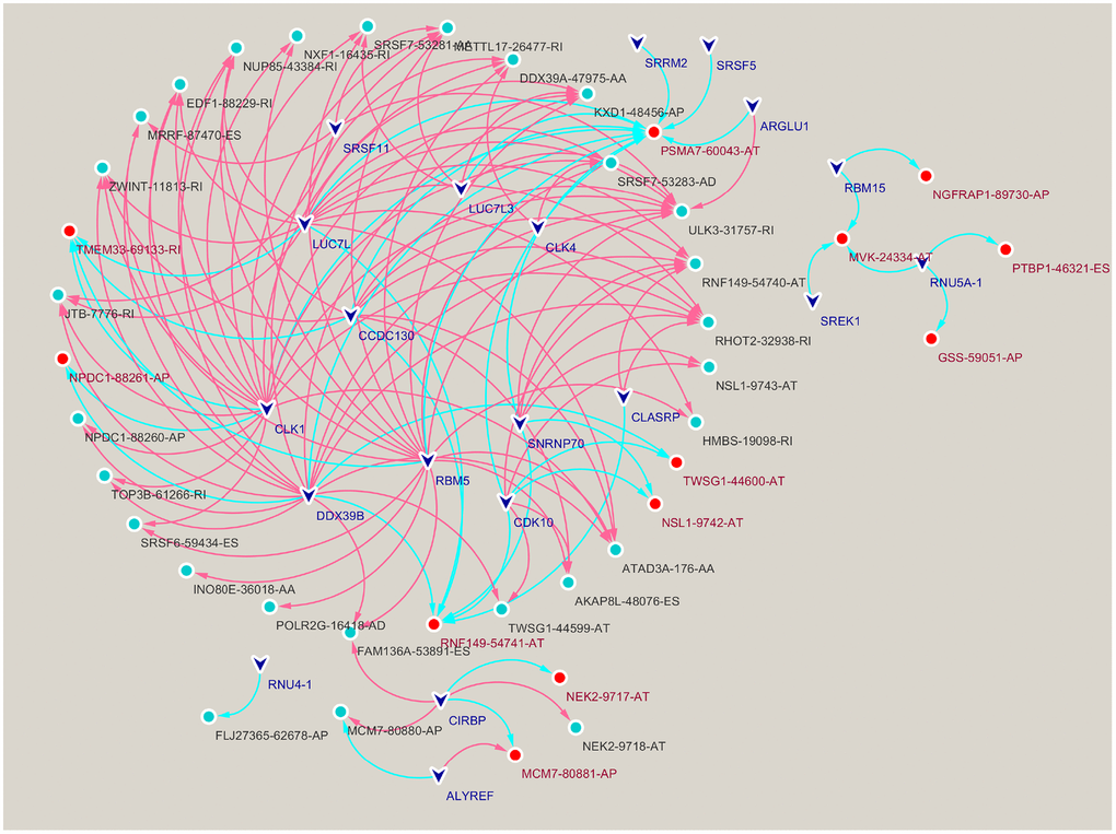Correlations between prognostic AS events and SFs were evaluated by Spearman’s analyses in LUAD patients from the TCGA dataset. Interactions were included when correlation coefficients were > 0.6 and p < 0.001. Then, an AS-SF interaction network was constructed and included prognostic AS events and related SFs.