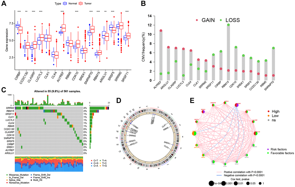 Based on the AS-SF interaction network, we identified 16 SFs (CIRBP, CCDC130, CLASRP, LUC7L3, CLK1, CLK4, ALYREF, RBM5, CDK10, SREK1, SNRNP70, RBM15, ARGLU1, SRSF5, SRRM2, and SRSF11) after excluding four genes (LUC7L, DDX39B, RNU4-1, and RNU5A-1) not found in training cohort. The differential expression of these SFs between normal and tumor specimens was analyzed in the TCGA cohort (Figure 4A). Most SFs were highly expressed in tumors, while CIRBP, ARGLU1, and SRSF5 were poorly expressed. Also, 13 SFs were identified as significant prognostic risk factors in LUAD (Supplementary Figure 2). To understand the genetic variation landscape of SFs in LUAD, we explored the incidence of CNVs and somatic mutations in the 16 SFs. CNV alterations were widespread. ALYREF, ARGLU1, CLASRP, LUC7L3, CLK4, CLK1, and SRRM2 were focused on the amplification in copy number, while the others had a frequency of CNV deletion (Figure 4B). Among the 561 LUAD samples, 55 had mutations in AS interacting SFs (Figure 4C). The chromosomal positions of CNV alteration in the 16 SFs are shown (Figure 4D). Based on the TCGA dataset, aa SF interaction network was constructed to show connections and the prognostic significance of SFs (Figure 4E). This network indicated that most SFs had positive correlation interactions, while ALYREF interacted with CIRBP, SRSF5, CLK1, CLK4 and RBM5 with negative correlations.