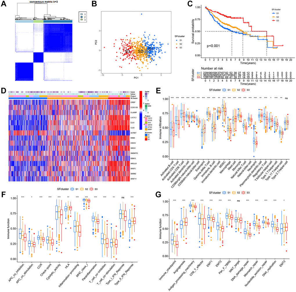 Consistent with immune phenotypes in SF clusters S1–S3, SF gene clusters A–C were characterized as immune-inflamed, immune-desert, and immune-excluded landscapes, respectively (Figure 6E, 6F). SF gene cluster B was identified with a relatively lower immune function and infiltrating abundance of most cells, and could be classified as an immune-inhibition and immune-desert group. In contrast, cluster A was significantly associated with an immune-inflamed status. Cluster C was defined as an immune-excluded phenotype. Similarly, SF gene clusters A–C exhibited a consistent trend in distinct tumor-related functions (Figure 6G).