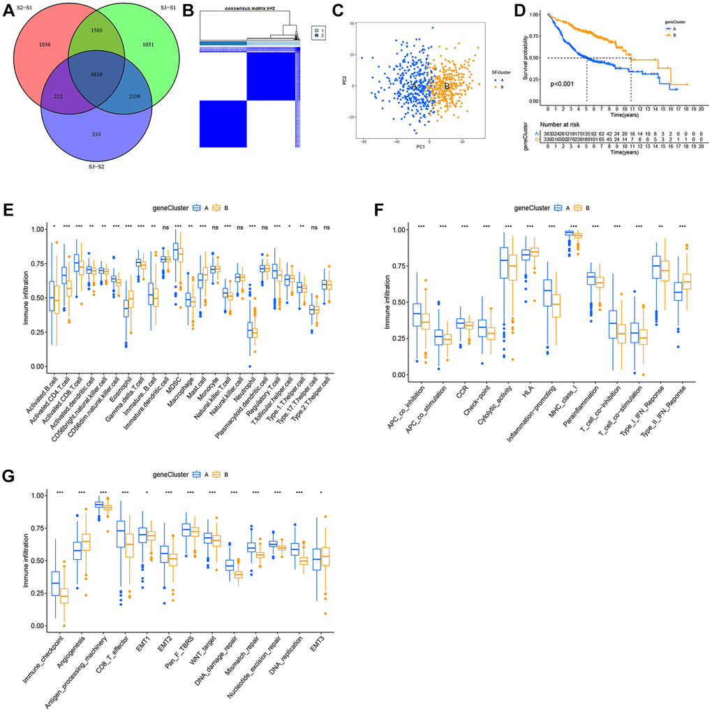 To explore the underlying mechanisms of TME remodeling as mediated by SFs, we filtered all DEGs between the three SF patterns and screened out 2,959 DEGs which were significantly associated with OS (Figure 6D, Supplementary Figure 5A). Based on these DEGs, a different genomic subtype was identified (Figure 6B, 6C). Two transcriptomic subtypes, based on SF pattern genes, were significantly associated with different survival outcomes and TME landscape. Interestingly, similar to SF patterns, SF cluster-S3 and gene cluster B, classified as immune-desert and immune “cold” phenotypes, respectively, demonstrated better prognoses. As shown (Figure 5G and Figure 6G), these clusters were associated with many cancer-related phenotypes, including EMT and Wnt targets. Also, we observed significant differences in immune characteristics between SF clusters; however, this did not mean no immune cell infiltration or immune-related cell factors were present (Figure 5E, 5F and Figure 6E, 6F). In fact, the three immune infiltration phenotypes, which represented the degree of immune cell infiltration in this study, was a relative description. Also, the cancer-immune cycle assumes that the best anti-cancer immune response depends on cooperation between immune cells, host factors, and tumor antigens, and that this cycle must be efficiently initiated and precisely maintained, otherwise, the cancer-immunity cycle is broken and replaced by inflammation-promoted tumor progression [53–55]. In our study, the inflammation potentially occurring in relative immune “hot” phenotypes also exerted part of the immunosuppressive function, such as the up-regulation of immunosuppressive cells MDSC, Treg, etc. This may cause dysregulated anti-tumor immunity and mediate malignant progression. To a certain extent, this explains why SF cluster-S3 and gene cluster B had a relatively better prognosis.
