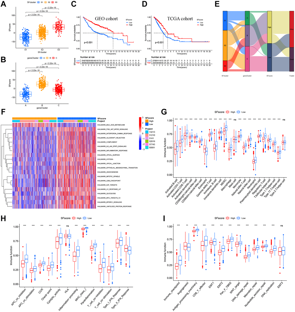 To further understand SFscore characteristics, we performed GSVA (Figure 7F) and showed that patients with high SFscore focused on the inhibition of immune pathways, carcinogenic pathways, and stromal pathways, including interferon gamma/alpha responses, IL-6-JAK-STAT3 signaling, allograft rejection, inflammatory responses, MYC signaling, E2F signaling, mTORC1 signaling, and EMT. Interestingly, bile acid metabolism was activated in the high SFscore group. We also examined correlations between TME cell infiltration abundance and SFscore (Supplementary Figure 6C). Interestingly, SFscore had significantly negative correlations with most immune infiltration cells, particularly activated CD4+ T cells, CD56dim natural killer cells, gamma delta T cells, MDSCs, natural killer T cells, and regulatory T cells (Supplementary Figure 6C). Similarly, ssGSEA showed a low abundance of most infiltrating immune cells and immune functions in groups with a high SFscore, except eosinophils and type-II interferon responses (Figure 7G, 7H). Also, a high SFscore was significantly related to lower tumor-related functions, including antigen processes, CD8 effectors, EMT, pan-F-TBRS, Wnt targets, DNA replication, DDR, mismatch repair, and nucleotide excision repair (Figure 7I). Nevertheless, angiogenesis was activated in groups with high SFscore. Finally, patients with high SFscore had low immune scores, stromal scores, ESTIMATE scores, and high tumor purity (Supplementary Figure 6D). In general, high SFscore were identified with immune-desert and stromal-inhibited landscapes, i.e., the immune “cold” group.