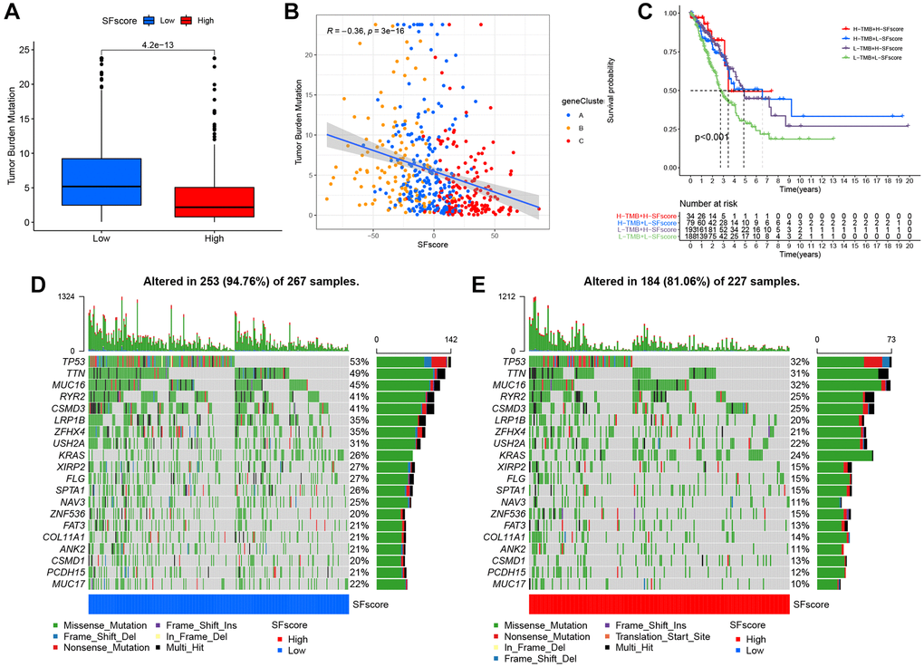 Several studies have highlighted associations between tumor somatic mutations and immunotherapeutic response [1, 44]. We explored the distribution patterns of tumor mutation burden in distinct SFscore groups and found that the low SFscore group had a higher TMB (Figure 8A). Additionally, the SFscore had a predominantly negative correlation with TMB across different gene clusters (Figure 8B). Survival analysis showed prominent differences among different TMB and SFscore combinations (Figure 8C). We next performed significantly mutated gene (SMG) analysis on LUAD samples in low SFscore versus high SFscore subgroups. LUAD samples with a low SFscore had significantly higher SMG rates (Figure 8D, 8E) and provided novel insights on SFscore in tumor somatic mutations, TME remodeling, and ICI therapy.