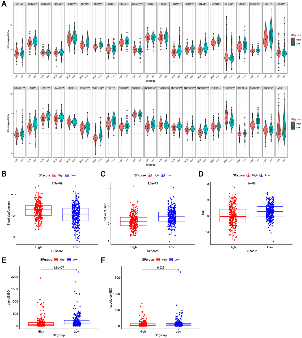 When compared with the low SFscore cohort, almost all ICPs were decreased in the high SFscore cohort, and accompanied by low T cell exclusion, higher T cell dysfunction, and lower TIDE scores (Figure 9). These data suggested that SFscore may provide critical guidelines for clinical immunotherapy.